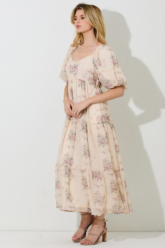 Floral Lurex Print Puff Sleeve Midi Dress