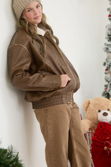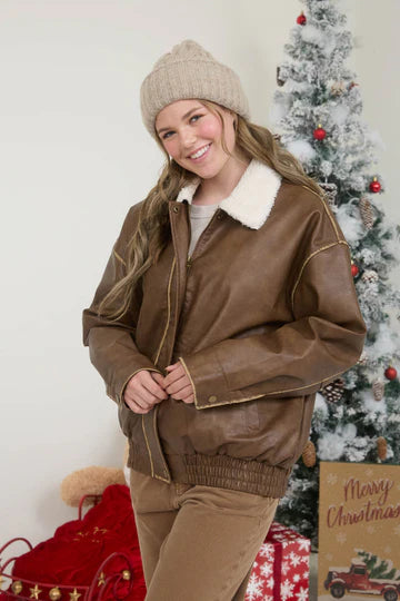 Faux Leather Shearling Collar Zip-Up Jacket