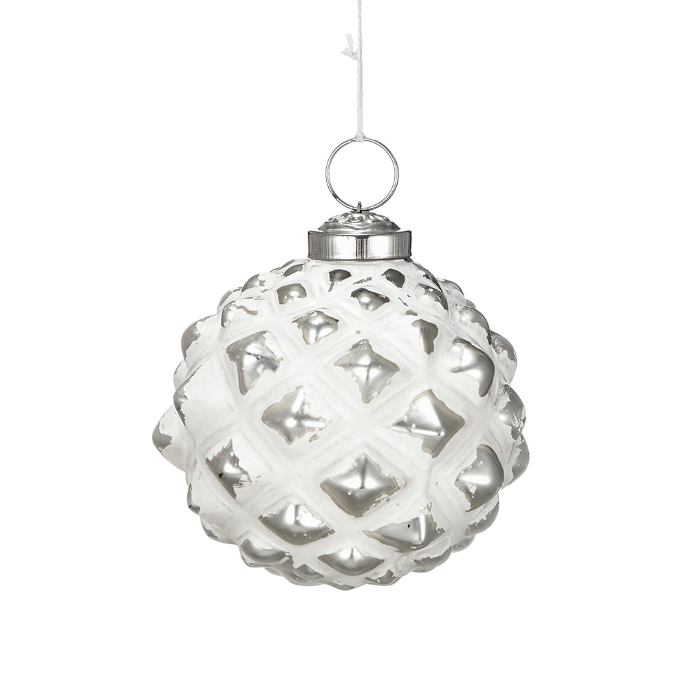 • Ornament mercury glass ball w/pinecone design shiny silver w/white