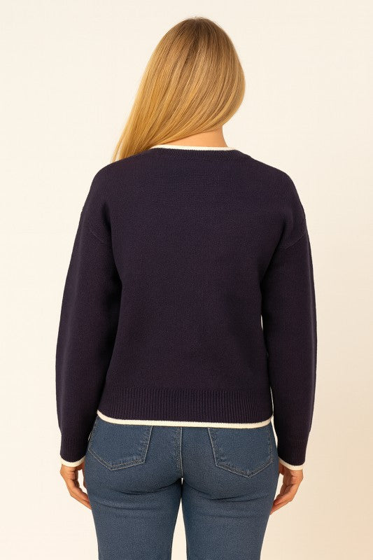 - Jacquard knit design of teddy bears, bows, candy canes, and a teapot motif in festive red, cream, and brown tones