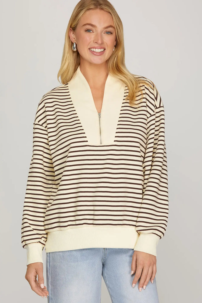 Split neck half zip long sleeves model is 5'9", wearing size small 70% polyester, 30% cotton